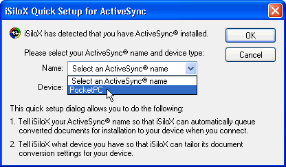 start iSiloX, you get the Quick Setup for ActiveSync® dialog